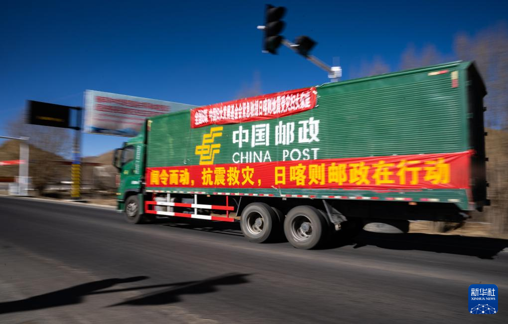 1月8日,在日喀则市境内的318国道,中国邮政的抗震救灾运输车辆向灾区方向驶去。