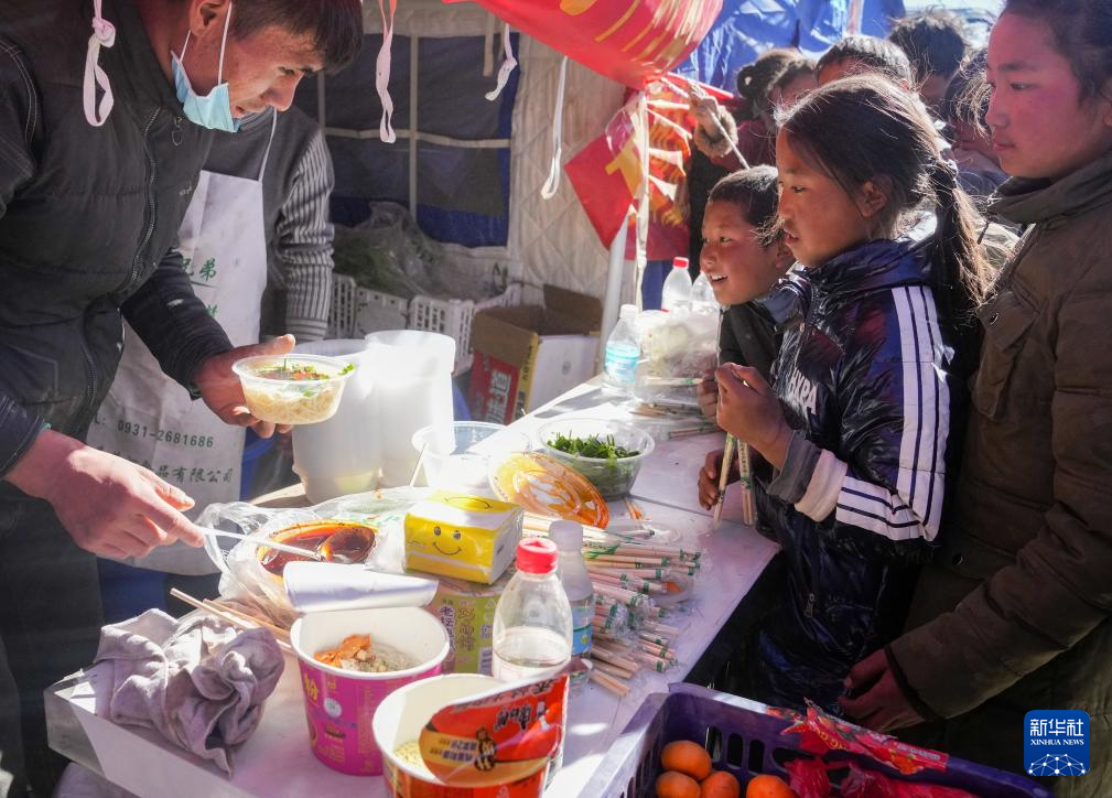 1月8日,在日喀则市定日县长所乡森嘎村的临时安置点,马仁(左一)为受灾小朋友免费供应面食。据马仁介绍,他来自定日县,和朋友一起来临时安置点为灾区群众免费提供面食。据悉,从7日下午两点开始,他们已送出近1200份面食。