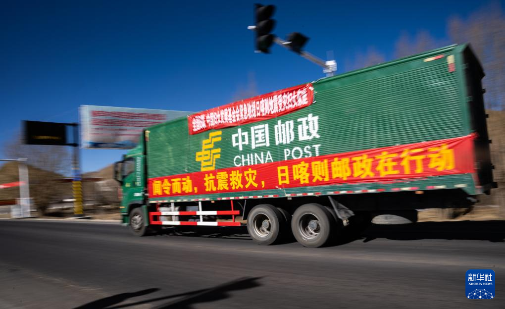 1月8日,在日喀则市境内的318国道旁,中国邮政的抗震救灾物资运输车辆向震中方向驶去。