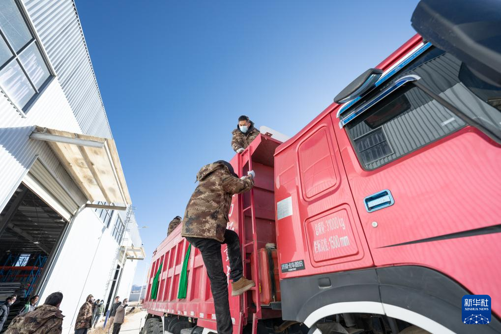 1月8日,在日喀则市经开区物资储备仓库,装好抗震救灾物资的车辆驶出园区。