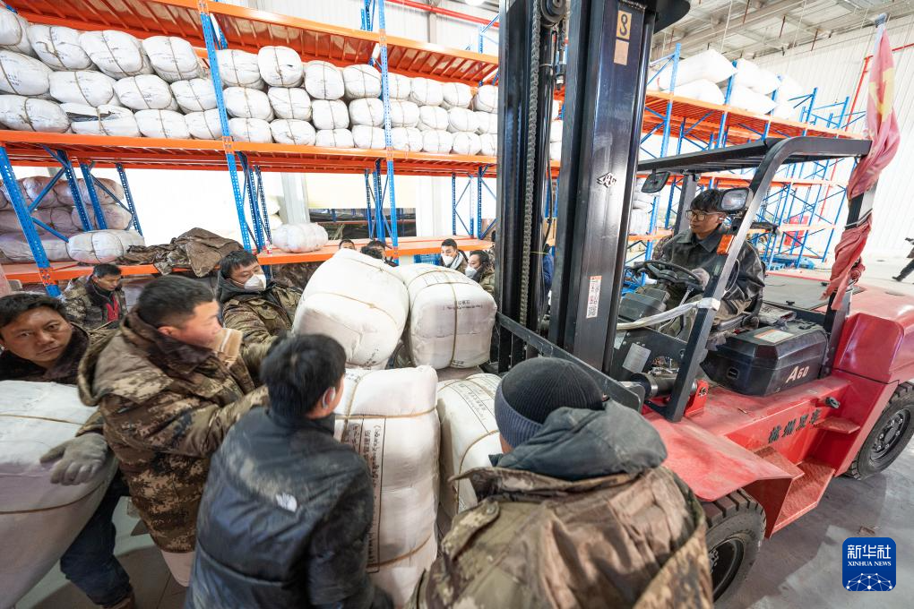 1月8日,在日喀则市经开区物资储备仓库,当地干部群众在搬运抗震救灾物资。