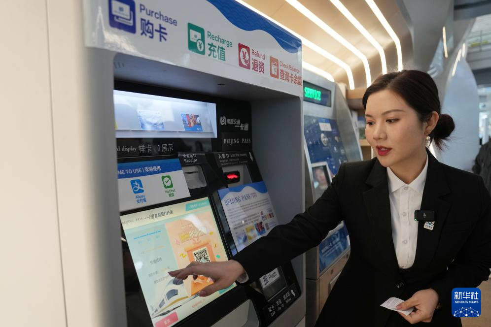 1月8日,在北京首都国际机场T3航站楼的“北京服务”机场服务点,一名工作人员展示为“BEIJING PASS”卡充值。该卡可用于外籍人士乘坐公交车、地铁,在北京多个文旅景区购票和商超购物中使用。