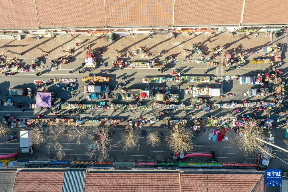 1月8日,人们在石马镇大集上采办年货(无人机照片)。
