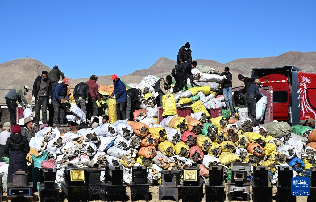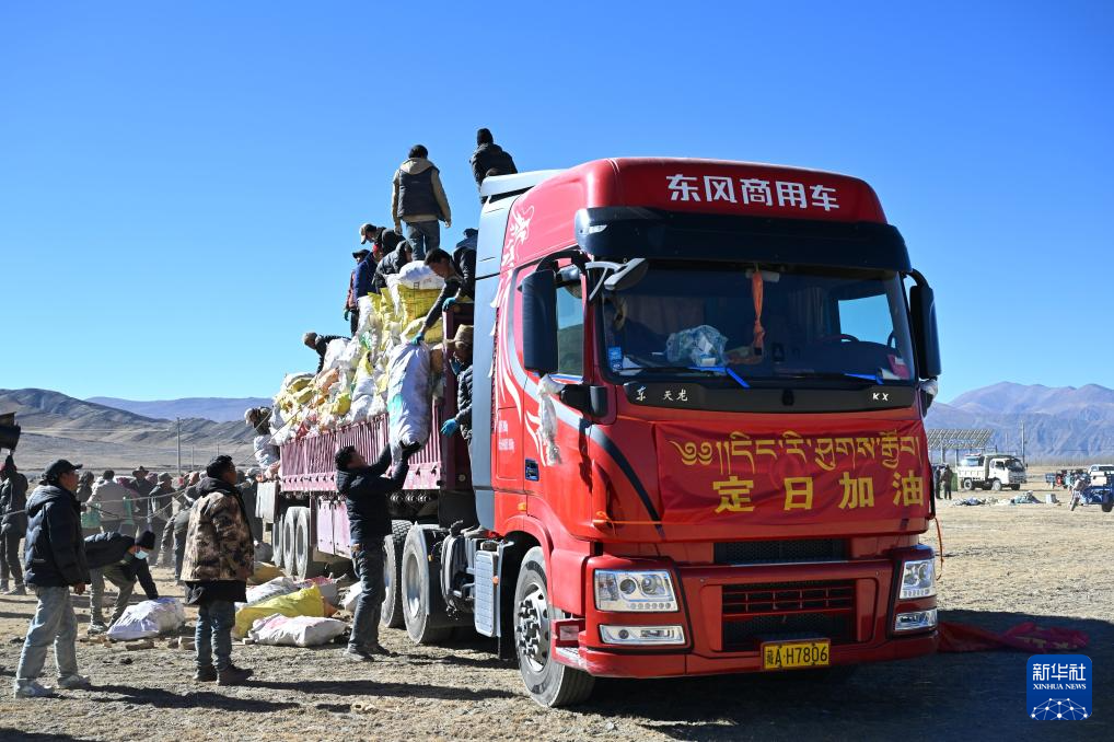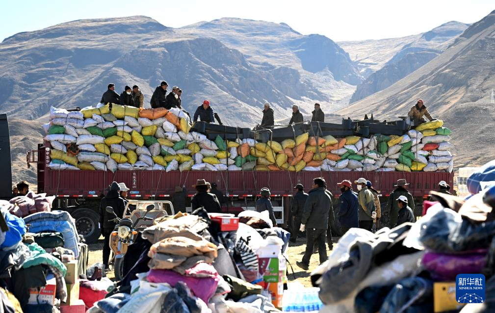 1月9日,受灾群众在措布村卸载救灾物资。
