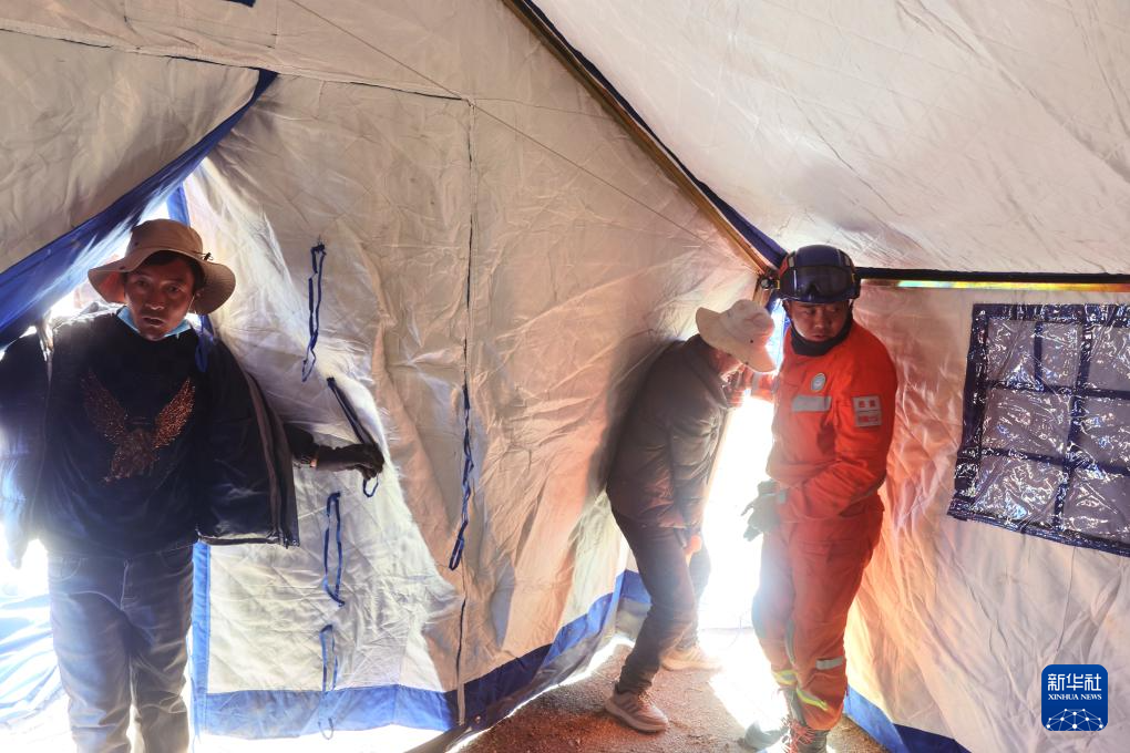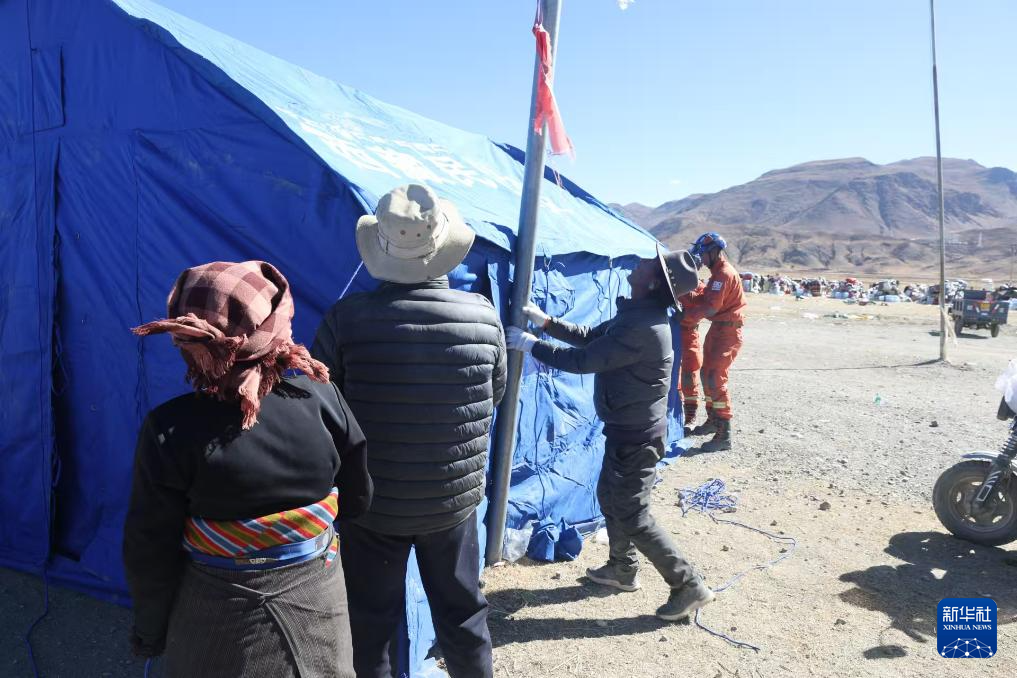 1月9日,救援人员在措布村帮助受灾群众搭建帐篷。