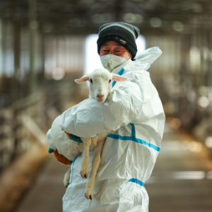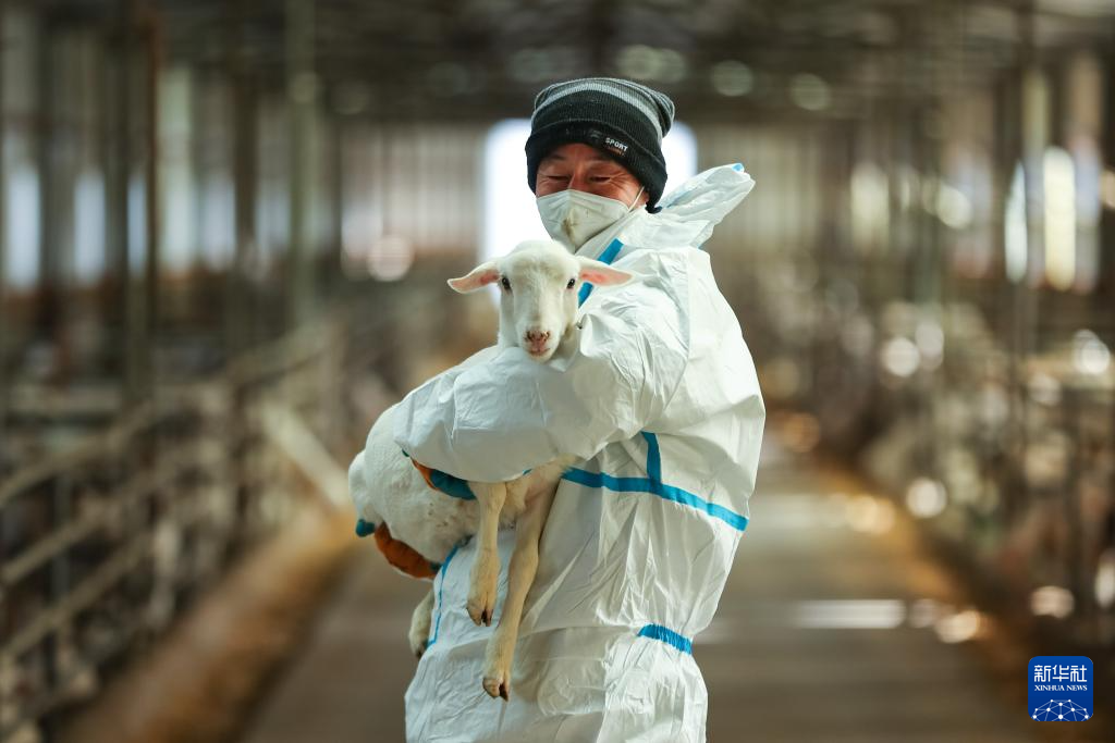 1月9日,在庆阳市环县毛井镇一家肉羊养殖合作社,工人展示新品种羔羊。