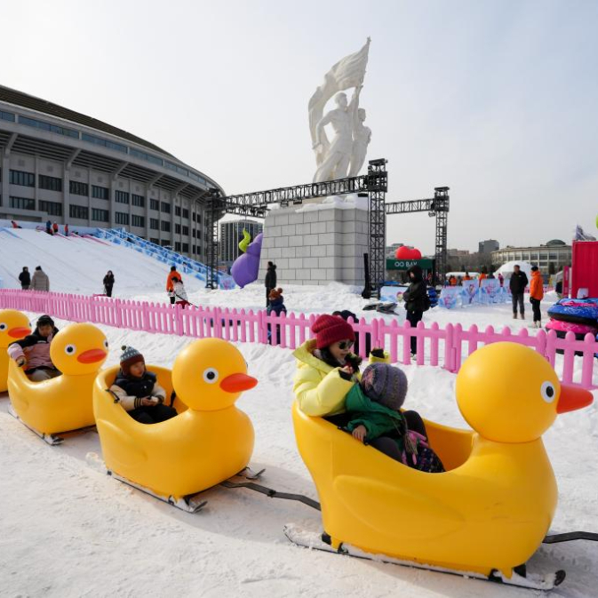 游客在国家速滑馆“冰丝带”冰雪狂欢季活动中体验雪上游乐项目(1月4日摄)。