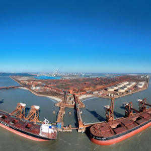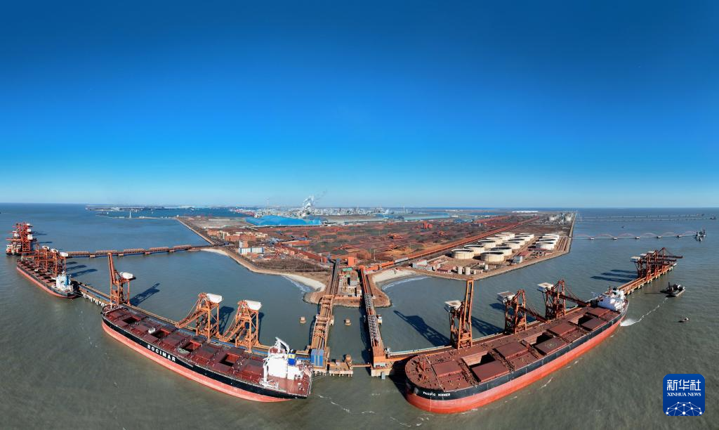 1月9日,轮船靠泊在唐山港曹妃甸港区矿石码头卸载(无人机全景照片)。