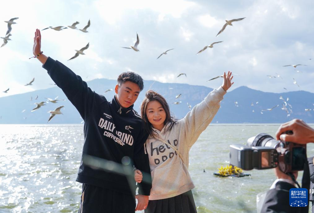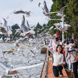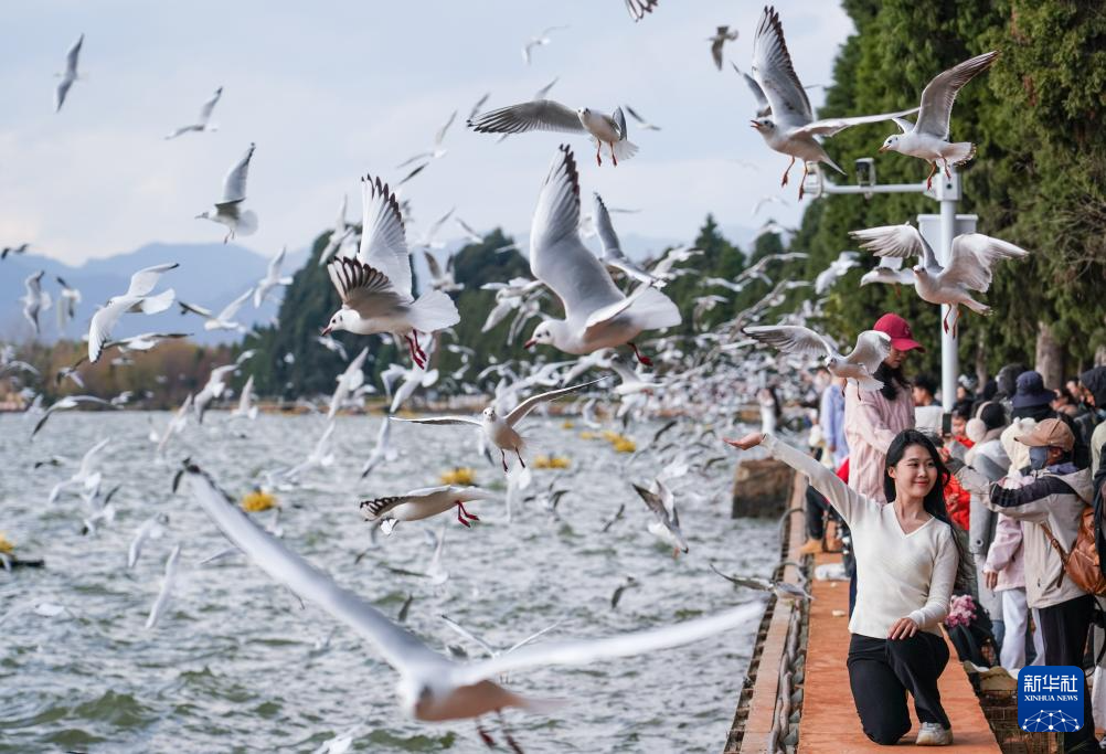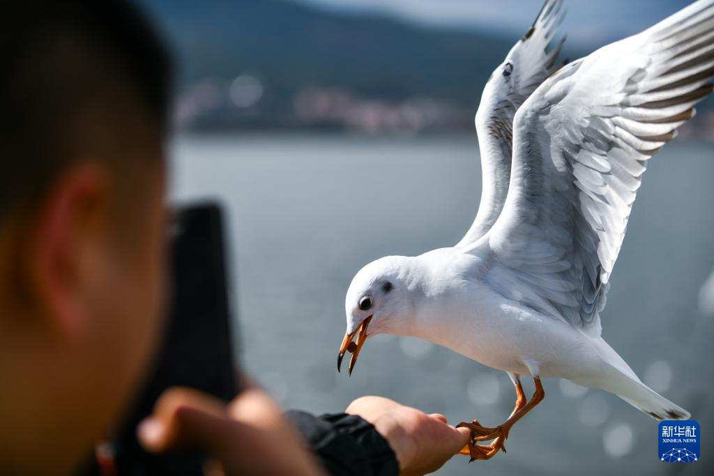 时下,云南省昆明市已进入观赏红嘴鸥的最佳季节。众多游客来到海埂大坝、海洪湿地公园等地观赏投喂红嘴鸥。