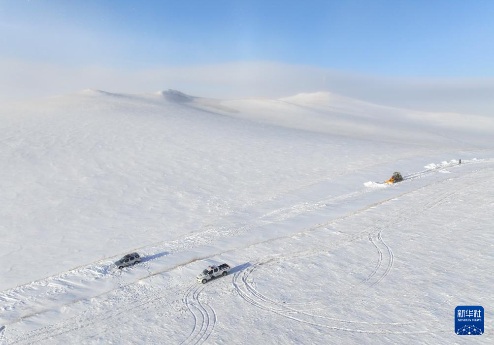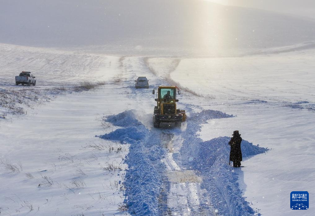 2024年12月27日,马背警队和舍伯尔图边境派出所的民警协调铲车,为受困群众铲雪通路(无人机照片)。