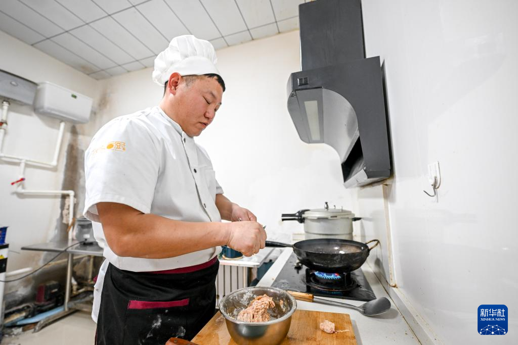 2025年1月8日,马背警队的民警额呢日乐在厨房做饭。
