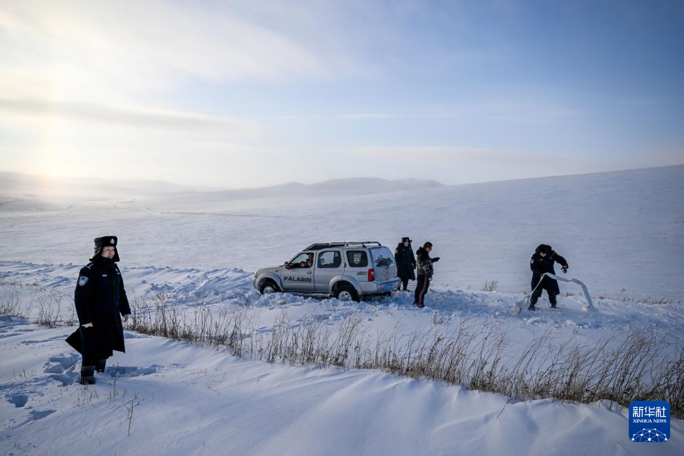 2024年12月27日,马背警队和舍伯尔图边境派出所的民警为受困群众车辆绑上拖车绳。