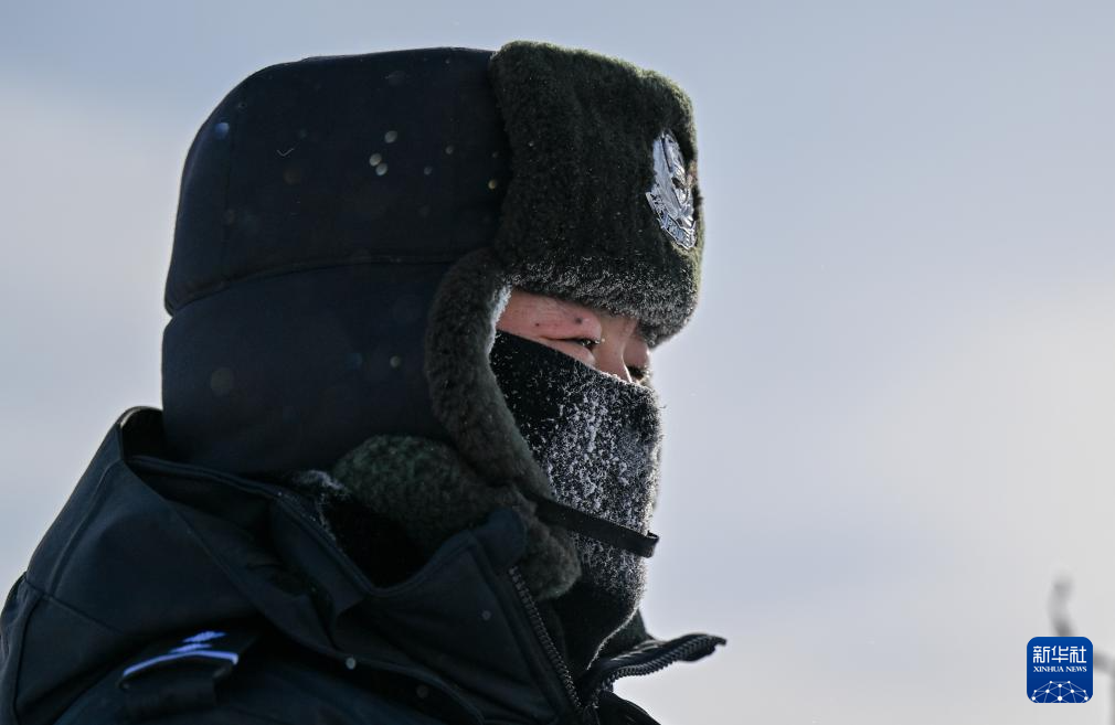 2025年1月8日,民警姚明明的面罩上结满了冰霜。