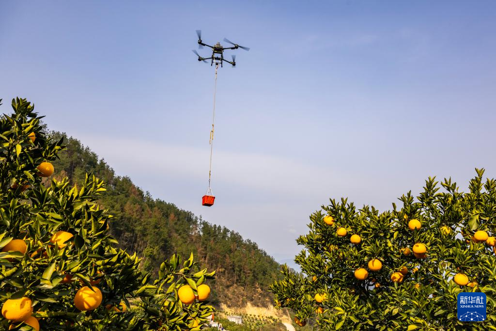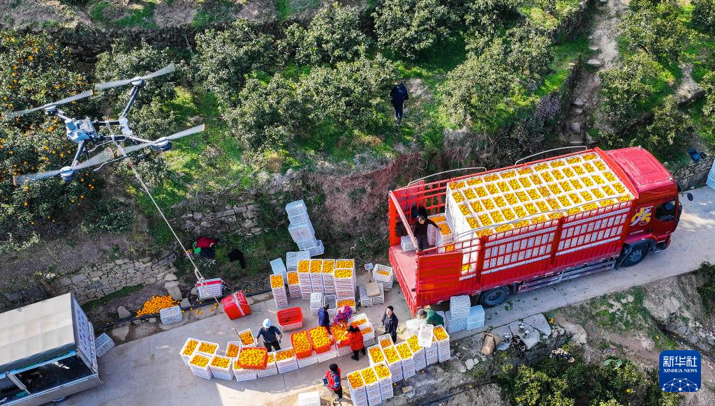 1月8日,秭归县郭家坝镇邓家坡村技术人员用无人机转运刚收获的脐橙。