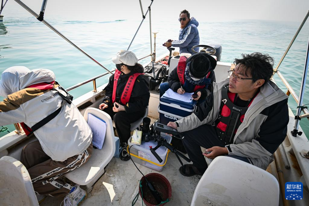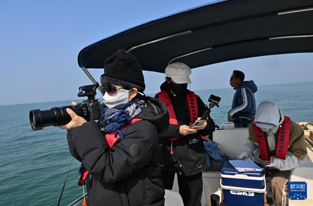 1月6日,在三娘湾-大风江口一带海域,北部湾鲸豚研究团队成员黄祥麟(左一)在考察船上拍摄影像素材。