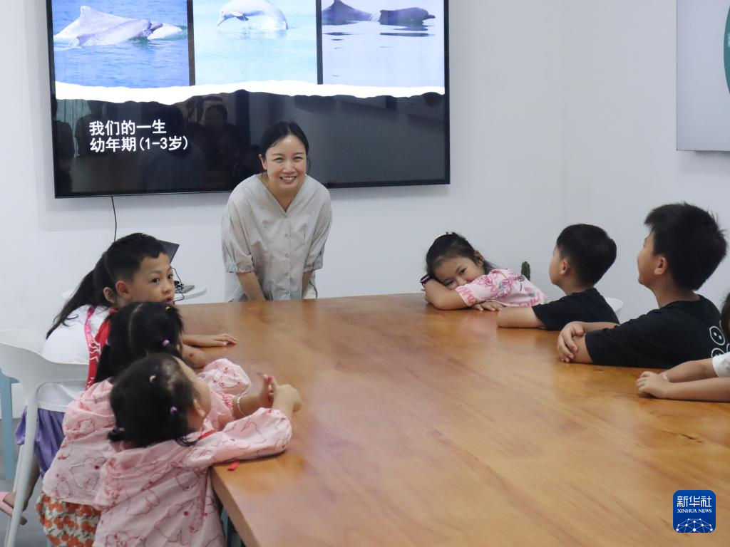 北部湾鲸豚研究团队成员吴海萍在钦州三娘湾景区的科学观豚教室为孩子们做科普(资料照片)。