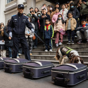 1月10日,在天心区坡子街派出所,市民在观看警犬训练。
