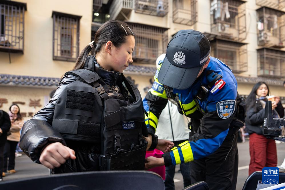1月10日,在天心区坡子街派出所,市民(左)试穿警用装备。