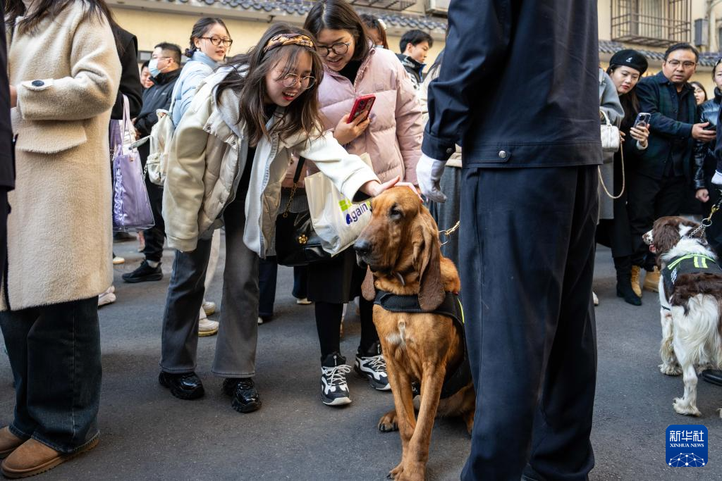 1月10日,在天心区坡子街派出所,市民与警犬互动。