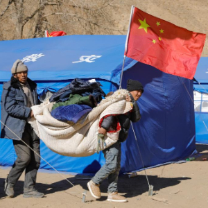 1月10日,在定日县长所乡古荣村,受灾群众准备将个人物品从临时安置帐篷搬入板房。