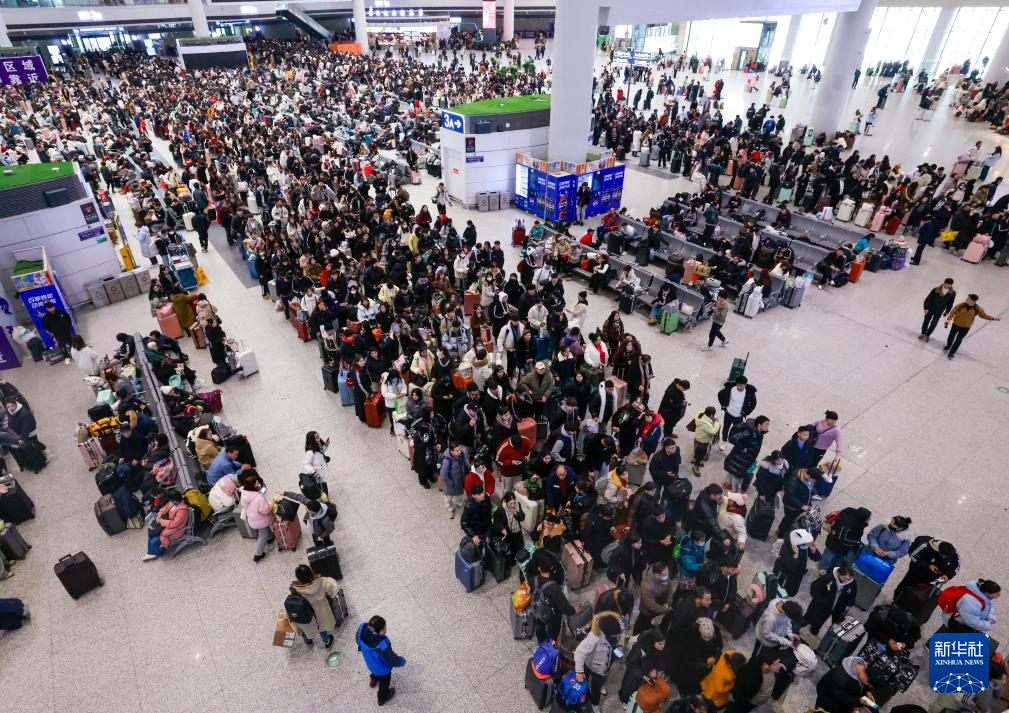 1月9日,在乌鲁木齐站候车大厅,乘坐7556次列车的旅客在排队等待乘车。