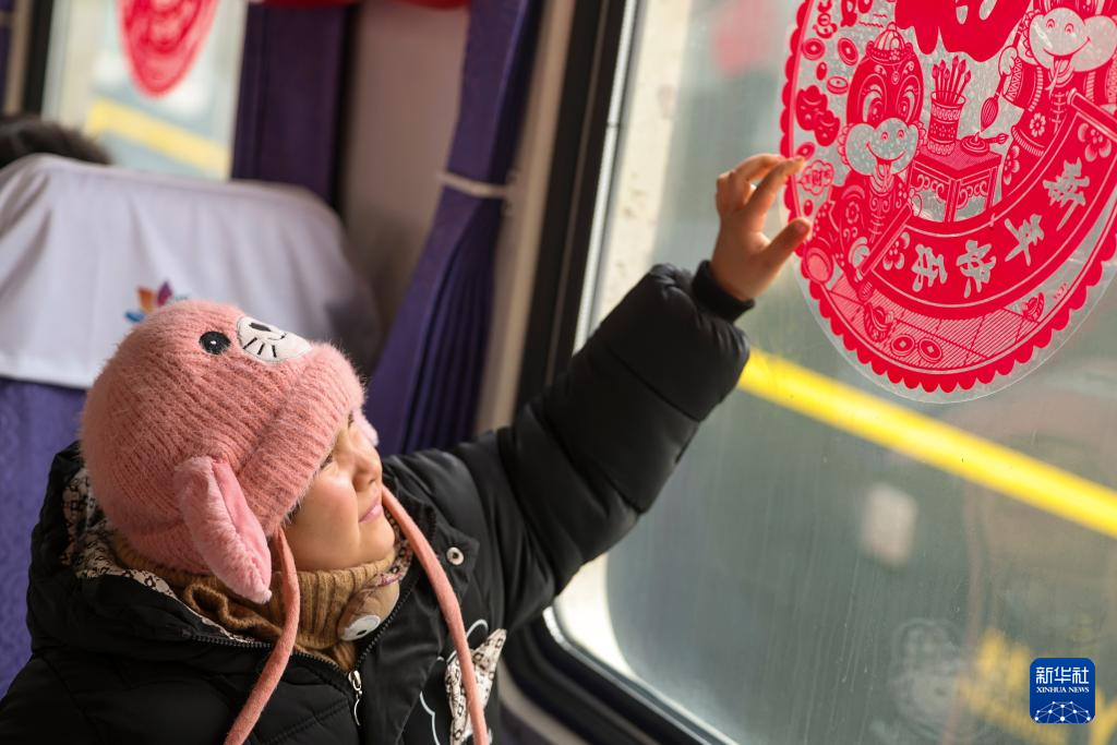 在7557次列车上,小朋友在抚摸窗花(1月2日摄)。