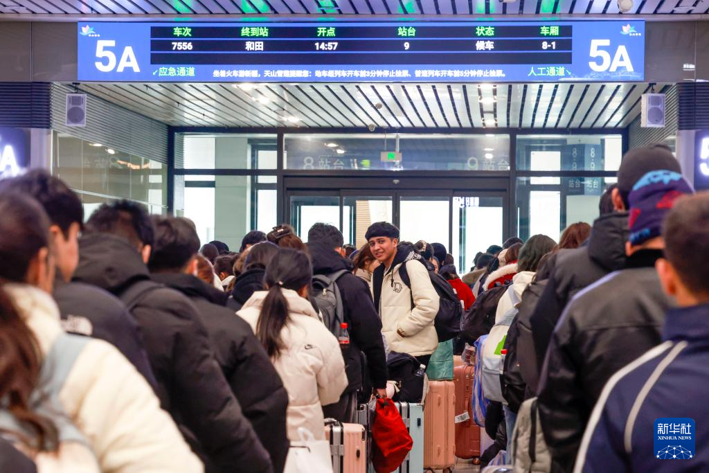 在喀什站候车大厅,乘坐7557次列车的旅客在排队等待乘车(1月2日摄)。