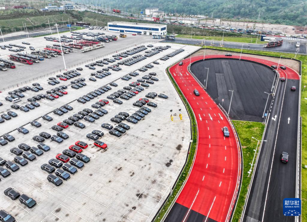 这是在位于重庆市两江新区的赛力斯汽车超级工厂拍摄的即将下线的新能源汽车(2024年6月7日摄)。