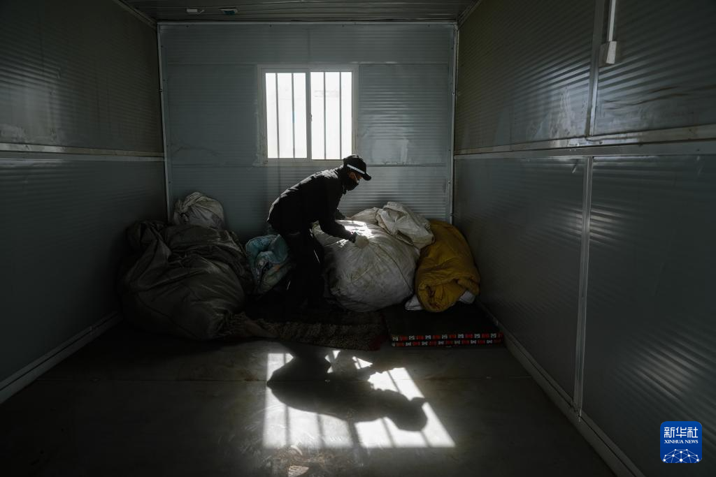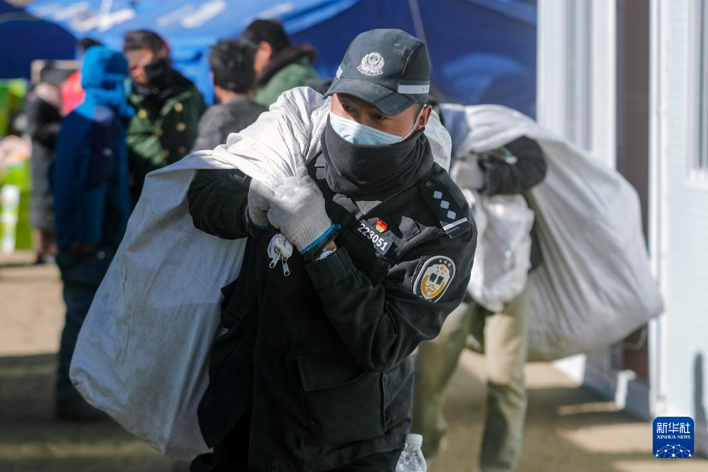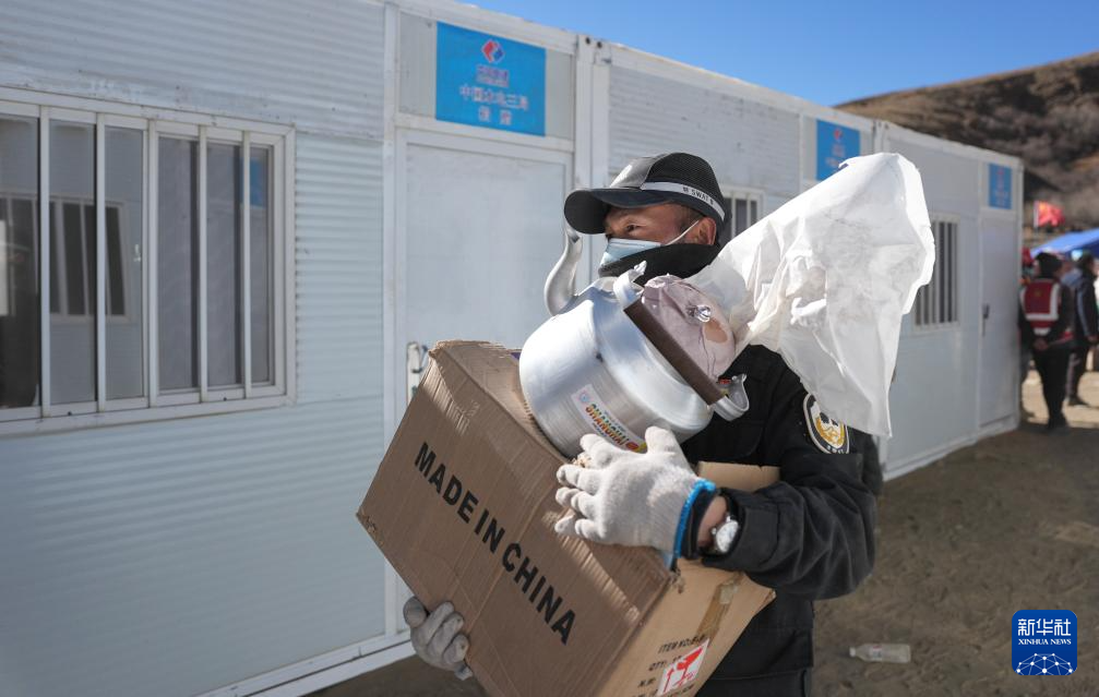 1月10日,在定日县长所乡古荣村,一名警察帮助受灾群众将物品从帐篷搬至板房。