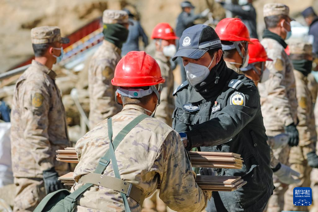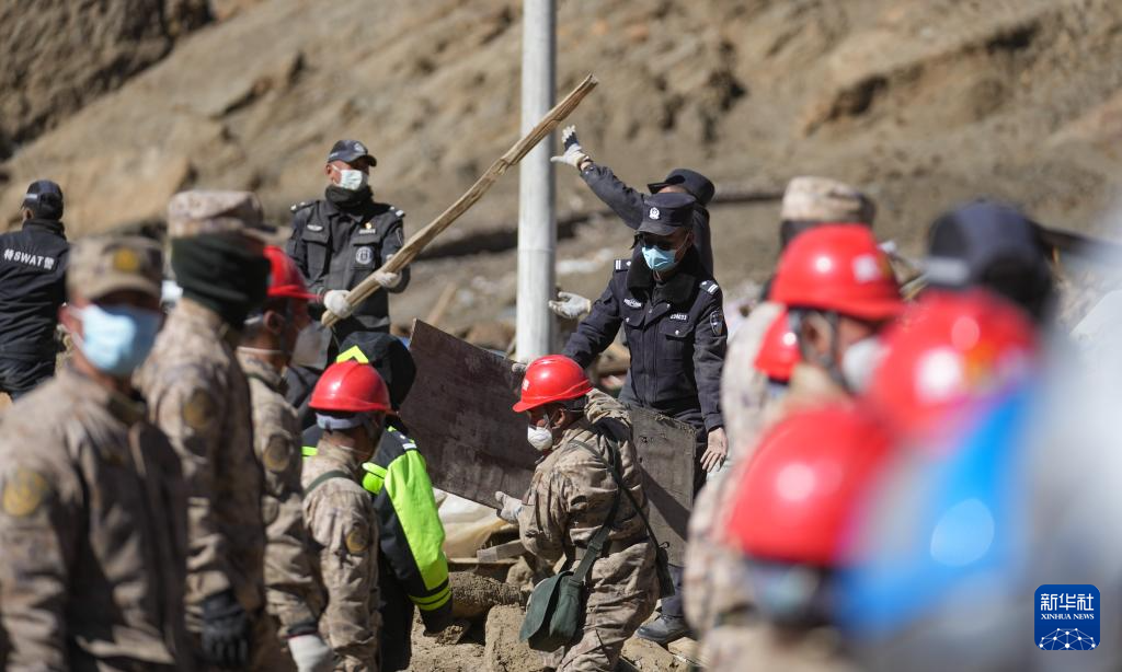 1月10日,在定日县长所乡古荣村,警察和各方救援力量一起清理废墟。