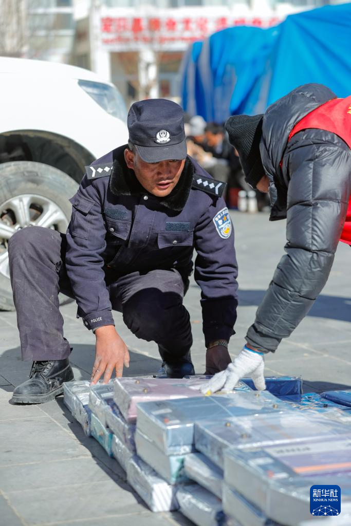 1月10日,在定日县民族团结广场,一名警察在清点将要运往受灾群众安置点的物资。