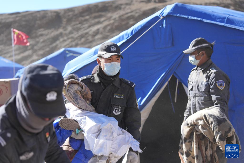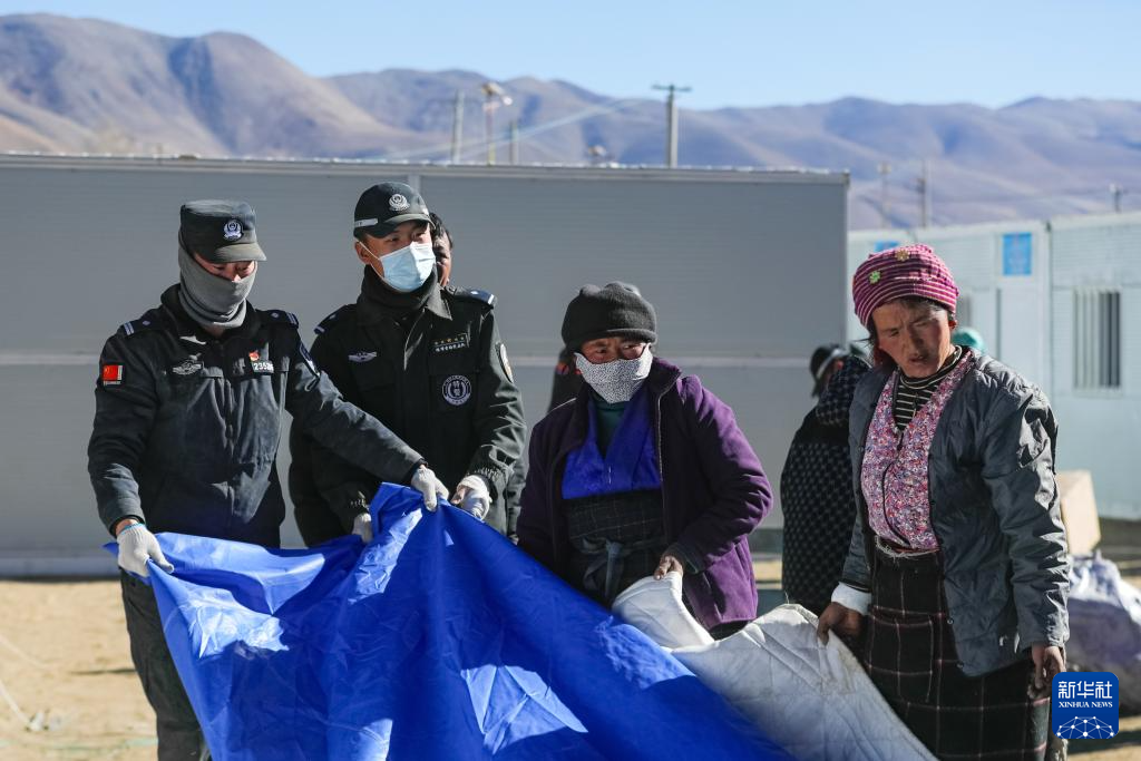 1月10日,在定日县长所乡古荣村,警察帮助受灾群众将物品从帐篷搬至板房。