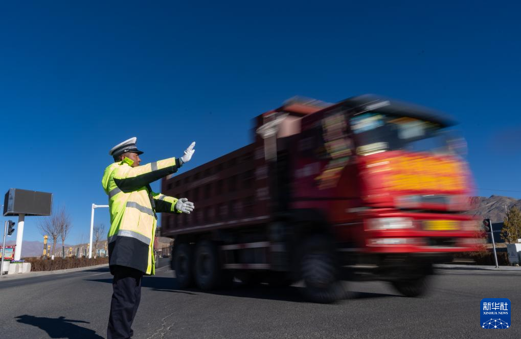 1月10日,在日喀则市区,交警加措在指挥交通,让完成救灾物资运输任务的救援车辆顺利出城。