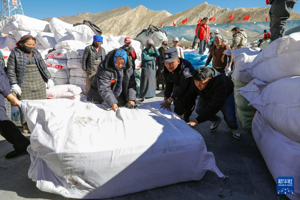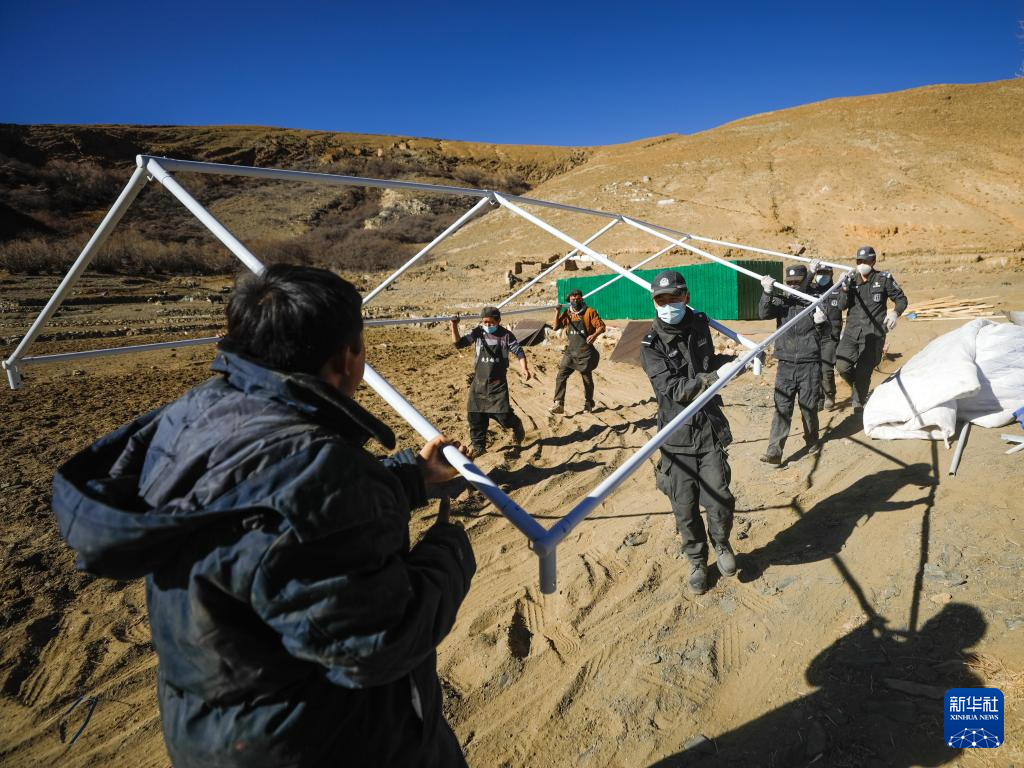 1月10日,在定日县长所乡古荣村,警察帮助搬入板房的受灾群众收帐篷。