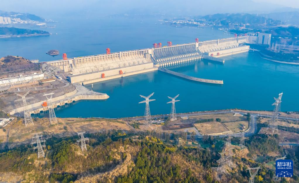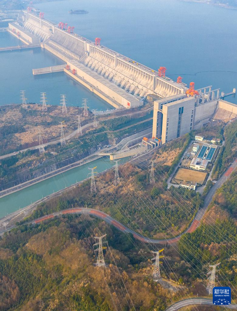 1月10日,在湖北宜昌拍摄的三峡大坝和三峡电站外送输电线路(无人机照片)。
