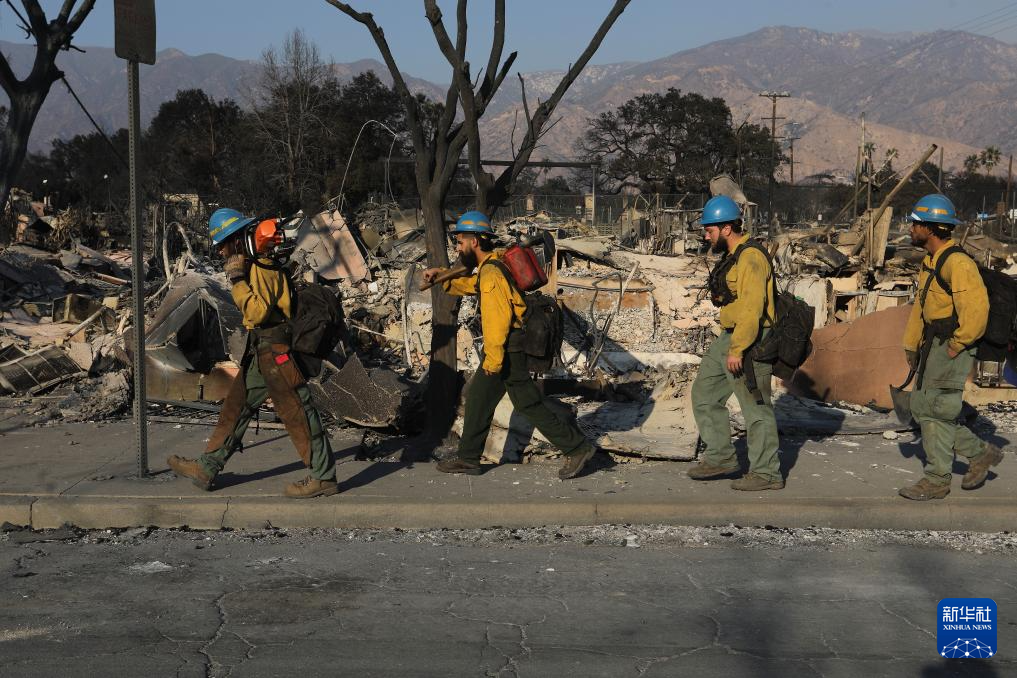 1月10日,在美国加利福尼亚州洛杉矶县阿尔塔迪纳地区,消防员在山火过火区域巡查。