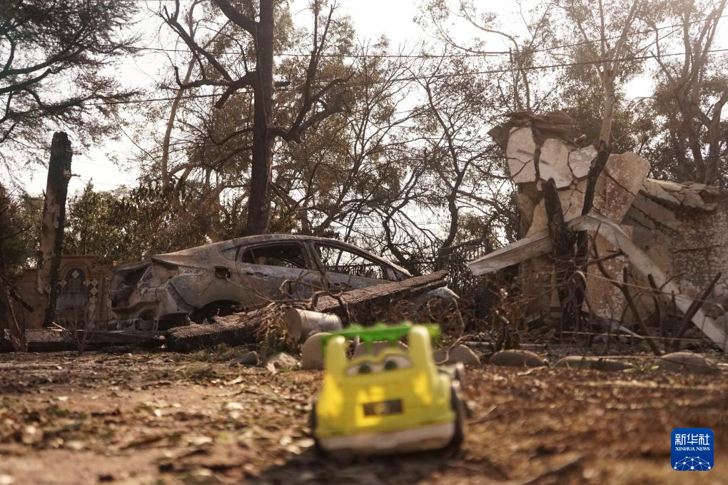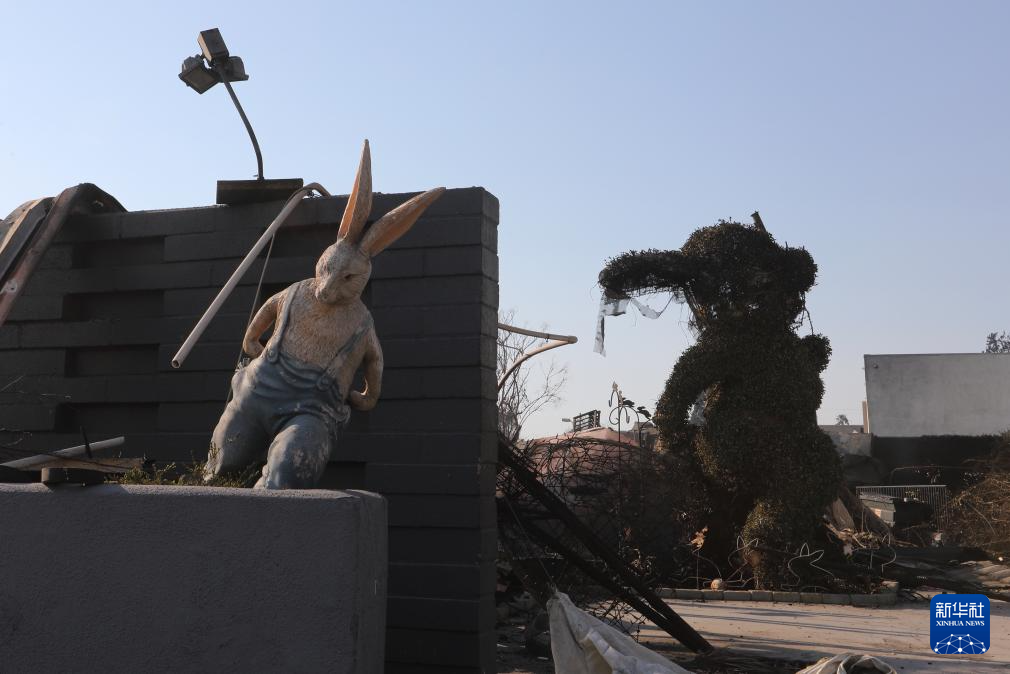这是1月10日在美国加利福尼亚州洛杉矶县阿尔塔迪纳地区拍摄的被山火摧毁的当地知名博物馆——“兔子博物馆”。