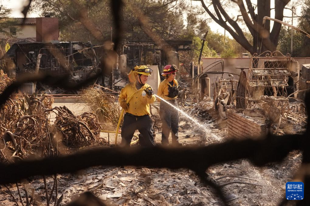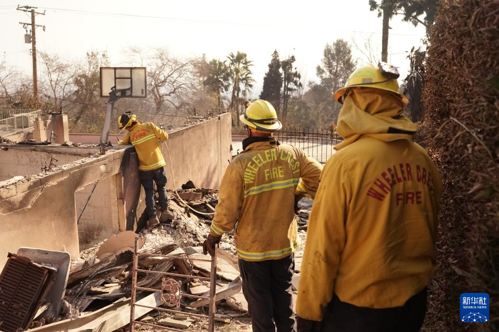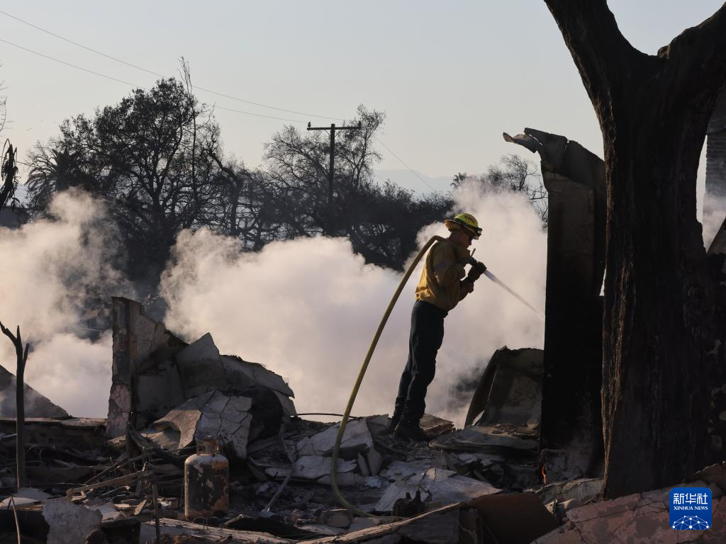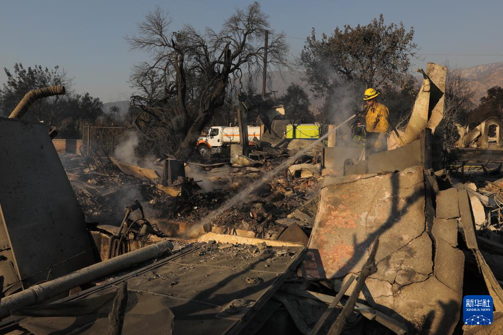 1月10日,在美国加利福尼亚州洛杉矶县阿尔塔迪纳地区,消防员正在努力扑灭山火过后建筑周围的热点区域。