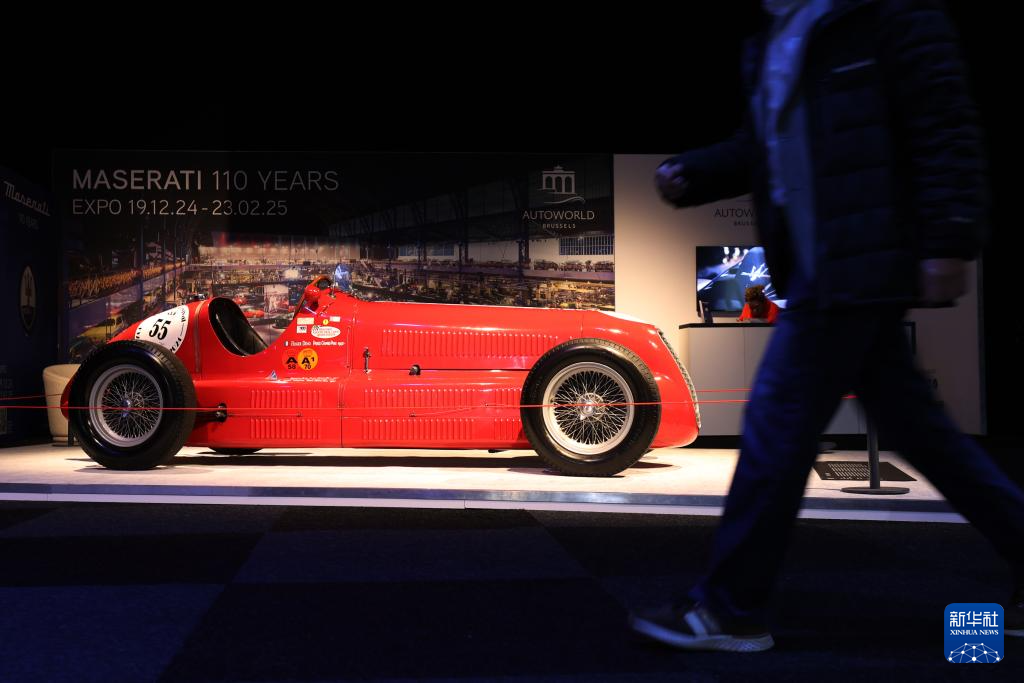 1月10日,在比利时布鲁塞尔举办的2025布鲁塞尔车展上,一名观众从玛莎拉蒂古董车前走过。