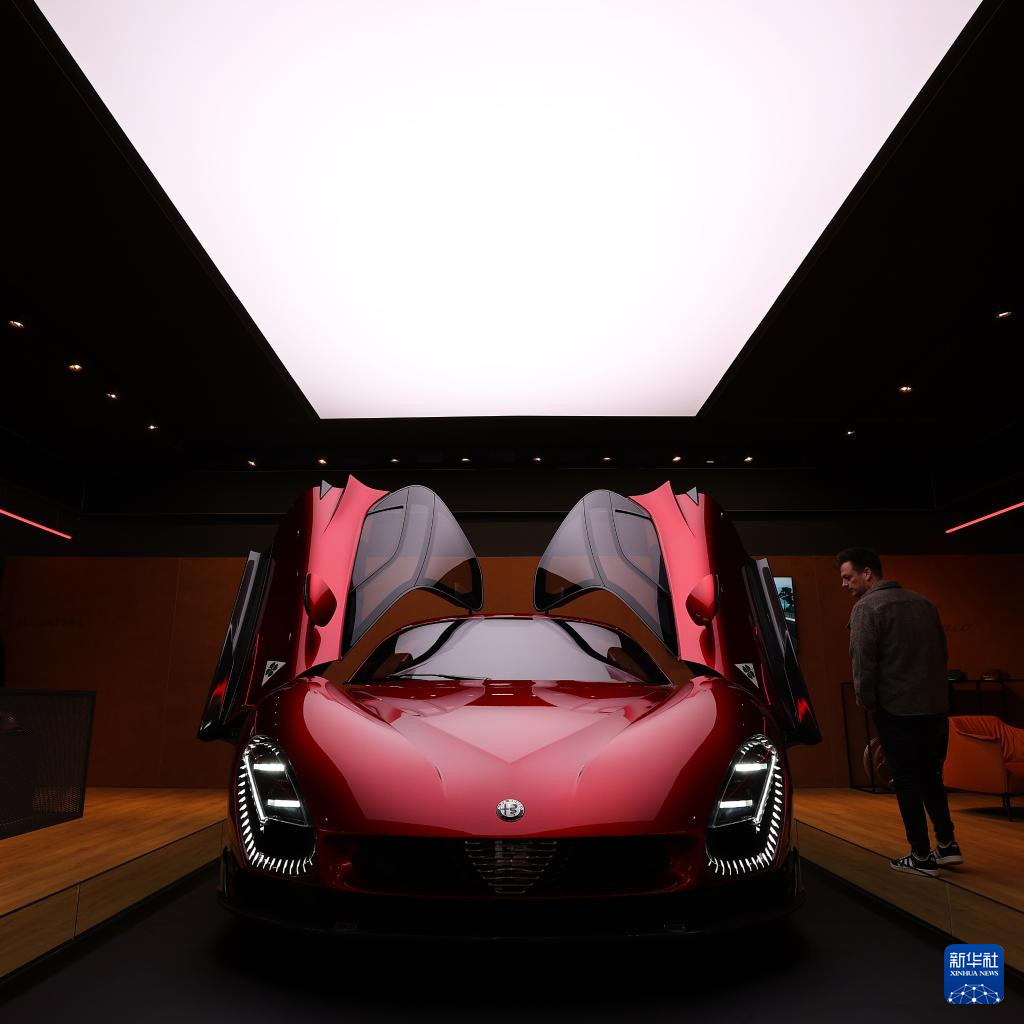 1月10日,在比利时布鲁塞尔举办的2025布鲁塞尔车展上,一名观众参观阿尔法罗密欧汽车。