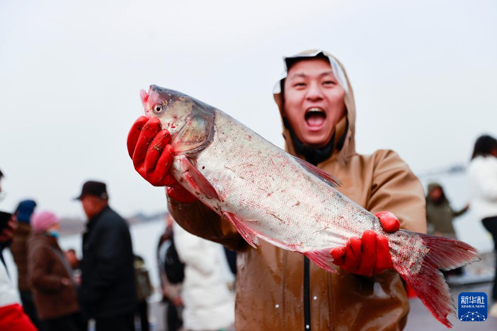 1月11日,参加捕鱼节游戏活动的观众兴奋地举起“战利品”。