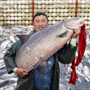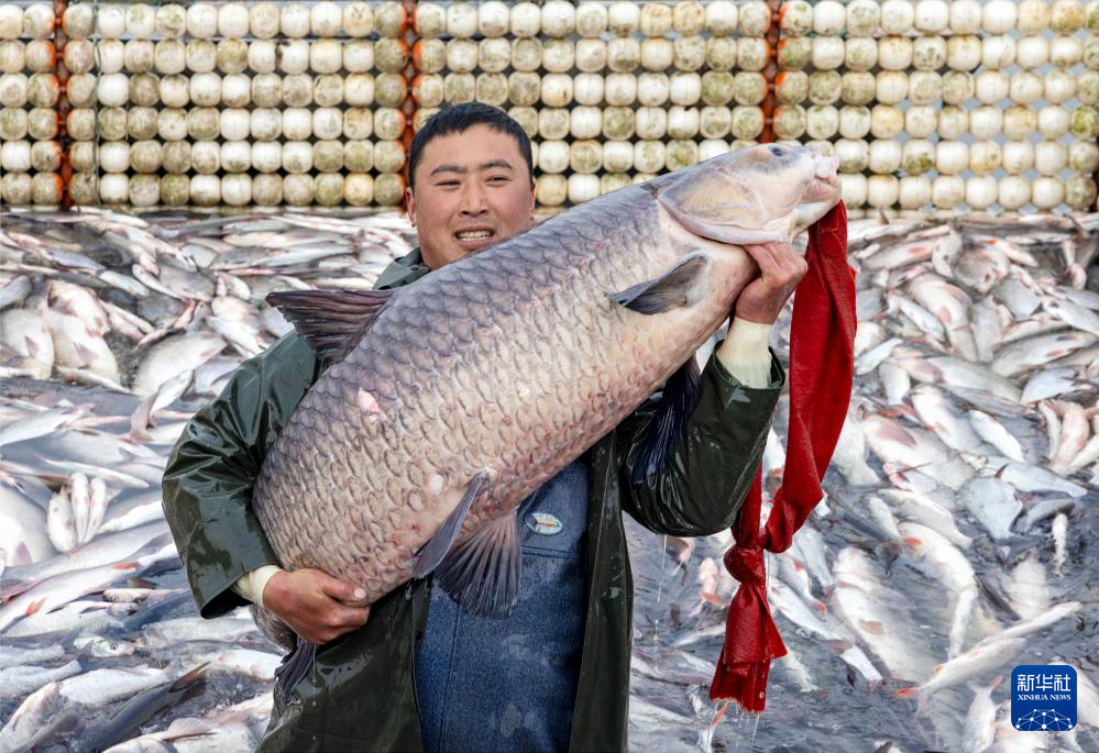 1月11日,渔民在泰州市姜堰区溱湖冬捕作业现场展示刚捕获的“溱湖鱼王”。
