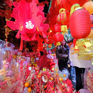 随着春节的临近,广西南宁市交易场附近的新春饰品摊位生意日益红火,众多市民前来采购春联、窗花等新春饰品。