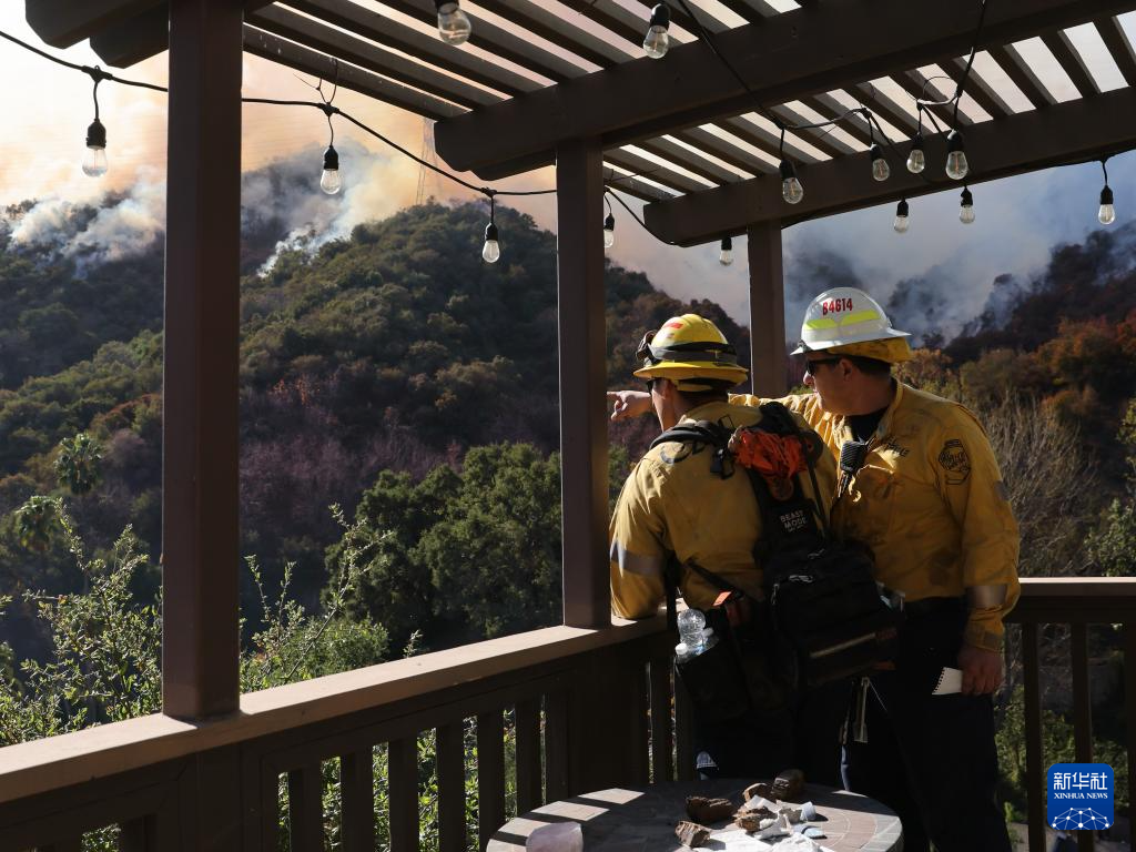 1月11日,消防员在美国加利福尼亚州洛杉矶曼德维尔峡谷的一座山丘顶部观望野火火势。