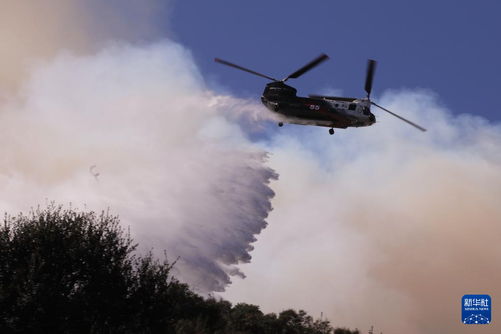 1月11日,一架消防直升机在美国加利福尼亚州洛杉矶曼德维尔峡谷的山丘上洒水,以防止野火进一步蔓延。