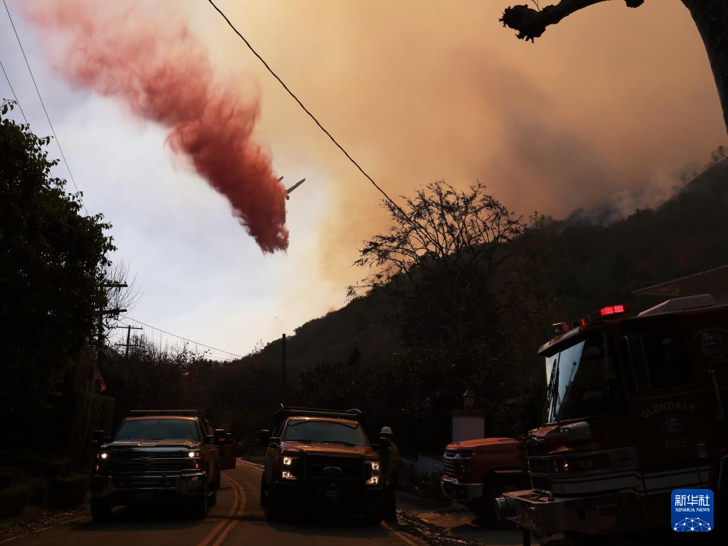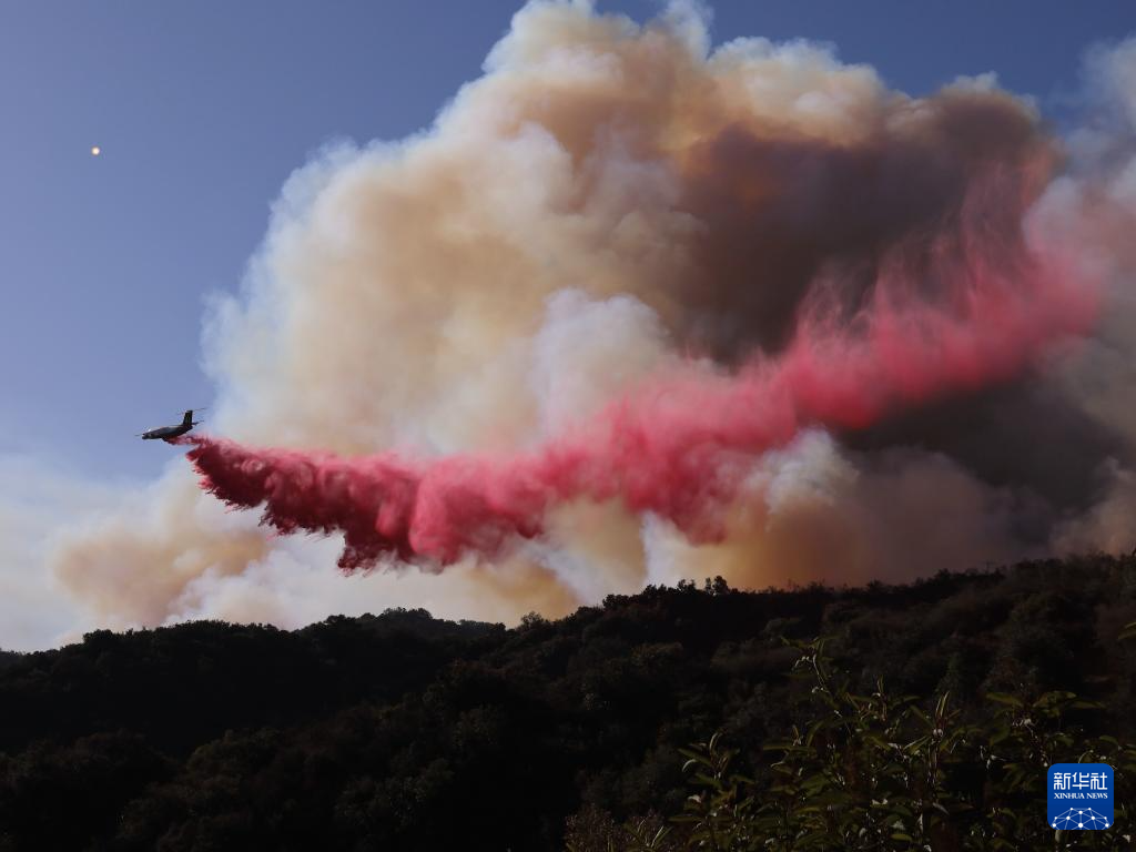 1月11日,一架消防飞机在美国加利福尼亚州洛杉矶曼德维尔峡谷的山丘上投放阻燃剂,以防止野火进一步蔓延。