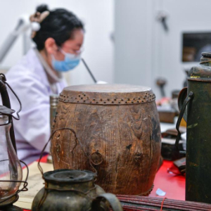 1月8日,贵州遵义会议纪念馆文物保护工作人员李若雪在进行文物修复。