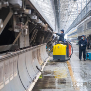 1月13日,在重庆西动车所,铁路工作人员在对列车进行清洗作业。