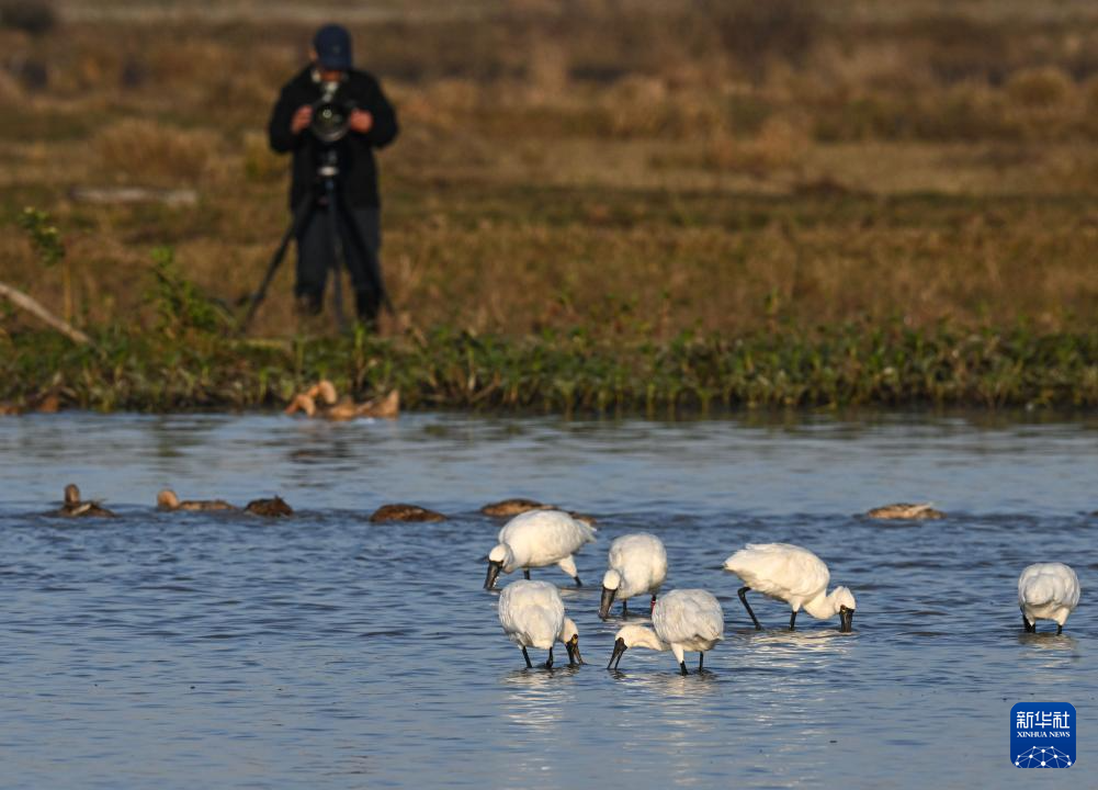 1月13日,观鸟爱好者在儋州湾湿地拍摄黑脸琵鹭。