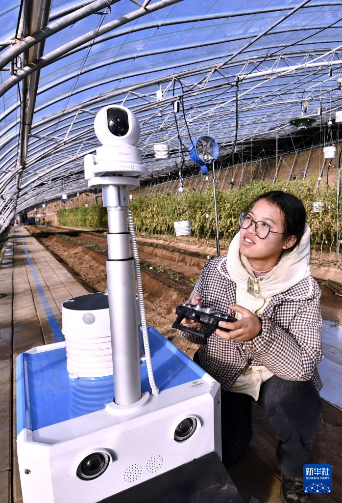 1月14日,技术人员在峰台村一处智能温室内检查农业巡检机器人的工作状态。